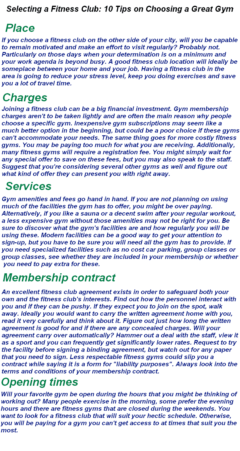 Everyone really likes alternatives even though it comes down towards fitness center account. Ensure you go with your gym account option it fits each your requirements as well as your finances. Never secure entering a long term contract if you don't have to. It's more straightforward to pay more the reassurance inside understanding that if you wish to prevent it is simple to cancel your very own account.These days countless gym operators think they have been smart simply by lowering the number of physical fitness trainers and/or fitness trainers they use. Certain even haven't any at all. Once joining your gym you need to know how to proceed to reach your goals. Ideally a workout instrcutor to fitness expert may help compose a program for you personally and/or explain to you utilizing the fitness center gear. Watch out for gyms it sell we your gym membership and then you will need to ask you for extra to show you the way to utilize will fitness equipment to own your gym plan written for you personally.